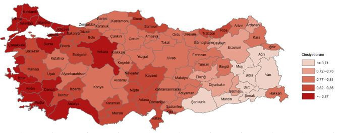 Bir başka eşitsizlik alanı olan cinsiyete göre ortalama eğitim süresine baktığımızda son on yılda kadınların eğitimdeki yerinin hâlâ ortalamanın altında ve erkeklerin gerisinde kaldığını görüyoruz. Nitekim TÜİK’in haritaladığı kadın erkek eğitim süresinin “cinsiyet oranı” il düzeyinde incelendiğinde eğitimde toplumsal cinsiyet eşitsizliğini bölgesel eşitsizlikle bir arada görmüş oluruz. Kadınların ortalama eğitim süresi batı illerinde daha yüksekken doğu illerinde ortalamanın gerisinde kalıyor.