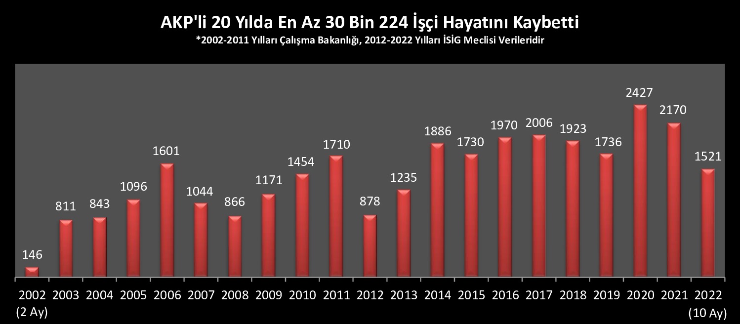 2002 yılının son iki ayında 146 işçi, 2003 yılında 811 işçi, 2004 yılında 843 işçi, 2005 yılında 1096 işçi, 2006 yılında 1601 işçi, 2007 yılında 1044 işçi, 2008 yılında 866 işçi, 2009 yılında 1171 işçi, 2010 yılında 1454 işçi, 2011 yılında 1710 işçi, 2012 yılında 878 işçi, 2013 yılında 1235 işçi, 2014 yılında 1886 işçi, 2015 yılında 1730 işçi, 2016 yılında 1970 işçi, 2017 yılında 2006 işçi, 2018 yılında 1923 işçi, 2019 yılında 1736 işçi, 2020 yılında 2427 işçi, 2021 yılında 2170 işçi ve 2022 yılının ilk on ayında 1521 işçi iş cinayetlerinde hayatını kaybetti…
