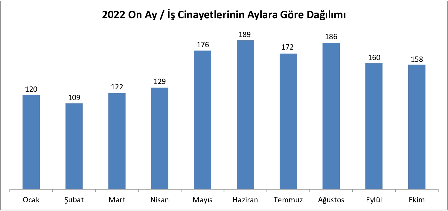2022 yılının ilk on ayında iş cinayetlerinin aylara göre dağılımı şöyle: Ocak ayında 120, Şubat ayında 109, Mart ayında 122, Nisan ayında 129, Mayıs ayında 176, Haziran ayında 189, Temmuz ayında 172, Ağustos ayında 186, Eylül ayında 160 ve Ekim ayında 158 işçi hayatını kaybetti… (Bilgilerimiz her ay güncellenmektedir.)