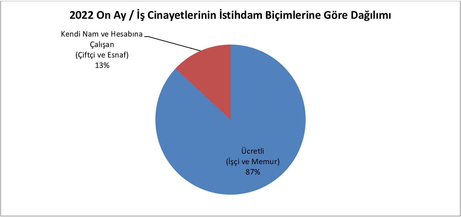 2022 yılının ilk on ayında iş cinayetlerinin istihdam biçimlerine göre dağılımına baktığımızda 1322 ücretli (işçi ve memur) ve 199 kendi nam ve hesabına çalışan (çiftçi ve esnaf) hayatını kaybetti. Yani ölenlerin yüzde 87’sini ücretliler yüzde 13’ünü ise kendi nam ve hesabına çalışanlar oluşturuyor…