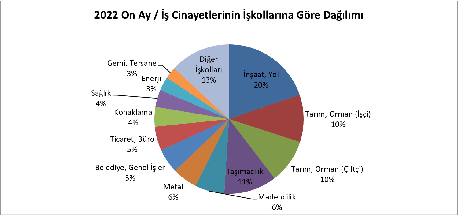 2022 yılının ilk on ayında iş cinayetlerinin işkollarına göre dağılımı şöyle: Tarım, Orman işkolunda 302 emekçi (156 işçi ve 146 çiftçi); İnşaat, Yol işkolunda 300 işçi; Taşımacılık işkolunda 173 işçi; Madencilik işkolunda 97 işçi; Metal işkolunda 83 işçi; Belediye, Genel İşler işkolunda 82 işçi; Ticaret, Büro, Eğitim, Sinema işkolunda 79 emekçi; Konaklama, Eğlence işkolunda 65 işçi; Sağlık, Sosyal Hizmetler işkolunda 56 işçi; Enerji işkolunda 46 işçi; Gemi, Tersane, Deniz, Liman işkolunda 39 işçi; Petro-Kimya, Lastik işkolunda 30 işçi; Savunma, Güvenlik işkolunda 29 işçi; Tekstil, Deri işkolunda 27 işçi; Ağaç, Kâğıt işkolunda 20 işçi; Gıda, Şeker işkolunda 16 işçi; Çimento, Toprak, Cam işkolunda 14 işçi; Basın, Gazetecilik işkolunda 7 işçi; Banka, Finans, Sigorta işkolunda 3 işçi; İletişim işkolunda 2 işçi; Elimizdeki veriler ışığında çalıştığı işkolunu belirleyemediğimiz 51 işçi hayatını kaybetti…