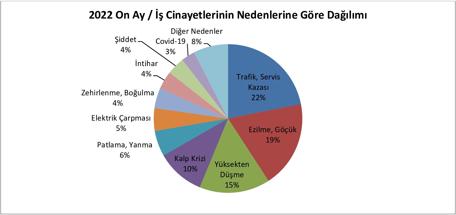 2022 yılının ilk on ayında iş cinayetlerinin nedenlerine göre dağılımı şöyle: Trafik, Servis Kazası nedeniyle 333 işçi; Ezilme, Göçük nedeniyle 288 işçi; Yüksekten Düşme nedeniyle 233 işçi; Kalp Krizi, Beyin Kanaması nedeniyle 161 işçi; Patlama, Yanma nedeniyle 85 işçi; Elektrik Çarpması nedeniyle 75 işçi; Zehirlenme, Boğulma nedeniyle 67 işçi; İntihar nedeniyle 60 işçi; Şiddet nedeniyle 60 işçi; Covid-19 nedeniyle 45 işçi; Nesne Çarpması, Düşmesi nedeniyle 19 işçi; Kesilme, Kopma nedeniyle 12 işçi; Diğer nedenlerden dolayı 83 işçi hayatını kaybetti…