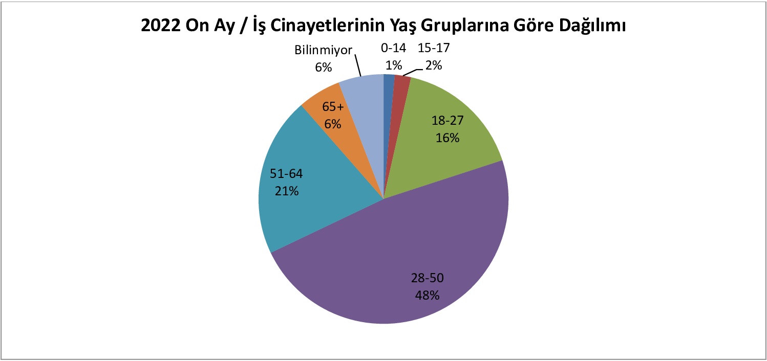 2022 yılının ilk on ayında iş cinayetlerinin yaş gruplarına göre dağılımı şöyle: 14 yaş ve altı 22 çocuk işçi, 15-17 yaş arası 32 çocuk/genç işçi, 18-27 yaş arası 250 işçi, 28-50 yaş arası 729 işçi, 51-64 yaş arası 314 işçi, 65 yaş ve üstü 85 işçi, yaşını bilmediğimiz 89 işçi hayatını kaybetti…