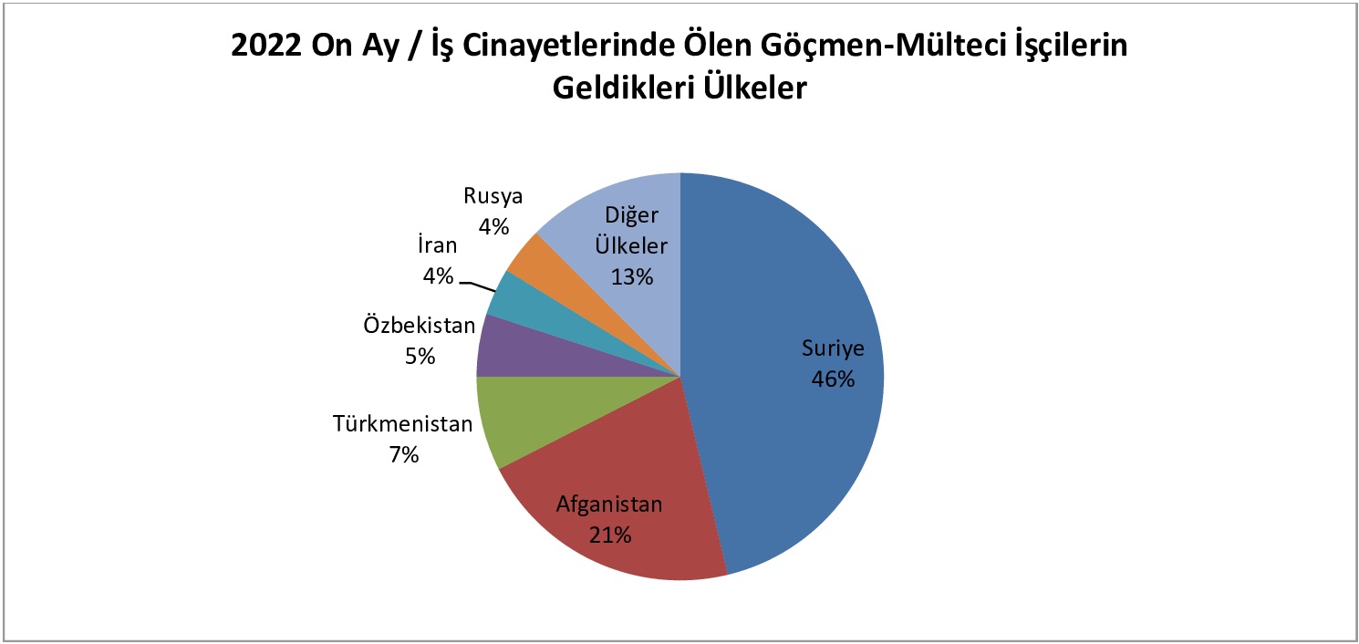2022 yılının ilk on ayında 80 mülteci/göçmen işçi hayatını kaybetti. Bu işçilerin geldikleri ülkelere bakarsak: 37 işçi Suriyeli; 17 işçi Afganistanlı; 6 işçi Türkmenistanlı, 4 işçi Özbekistanlı; 3’er işçi İranlı ve Rusyalı; 1’er işçi Azerbaycan, Belaruslu, Endonezyalı, Iraklı, Kuveytli, Nijeryalı, Pakistanlı, Sırbistanlı, Ukraynalı ve Yunanistanlı…