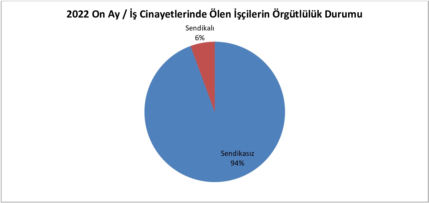 2022 yılının ilk on ayında iş cinayetlerinde ölenlerin 85’i (yüzde 5,58) sendikalı işçi, 1436’sı ise (yüzde 94,42) sendikasız. Sendikalı işçiler madencilik, metal, belediye, kimya, sağlık, enerji, taşımacılık, tarım, iletişim, eğitim, tersane ve güvenlik işkollarında çalışıyordu.