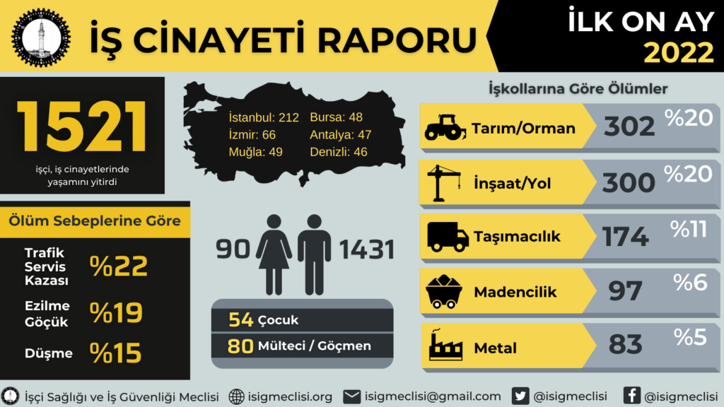 2022 yılının ilk on ayında iş cinayetlerinin nedenlerine göre dağılımı şöyle: Trafik, Servis Kazası nedeniyle 333 işçi; Ezilme, Göçük nedeniyle 288 işçi; Yüksekten Düşme nedeniyle 233 işçi; Kalp Krizi, Beyin Kanaması nedeniyle 161 işçi; Patlama, Yanma nedeniyle 85 işçi; Elektrik Çarpması nedeniyle 75 işçi; Zehirlenme, Boğulma nedeniyle 67 işçi; İntihar nedeniyle 60 işçi; Şiddet nedeniyle 60 işçi; Covid-19 nedeniyle 45 işçi; Nesne Çarpması, Düşmesi nedeniyle 19 işçi; Kesilme, Kopma nedeniyle 12 işçi; Diğer nedenlerden dolayı 83 işçi hayatını kaybetti…