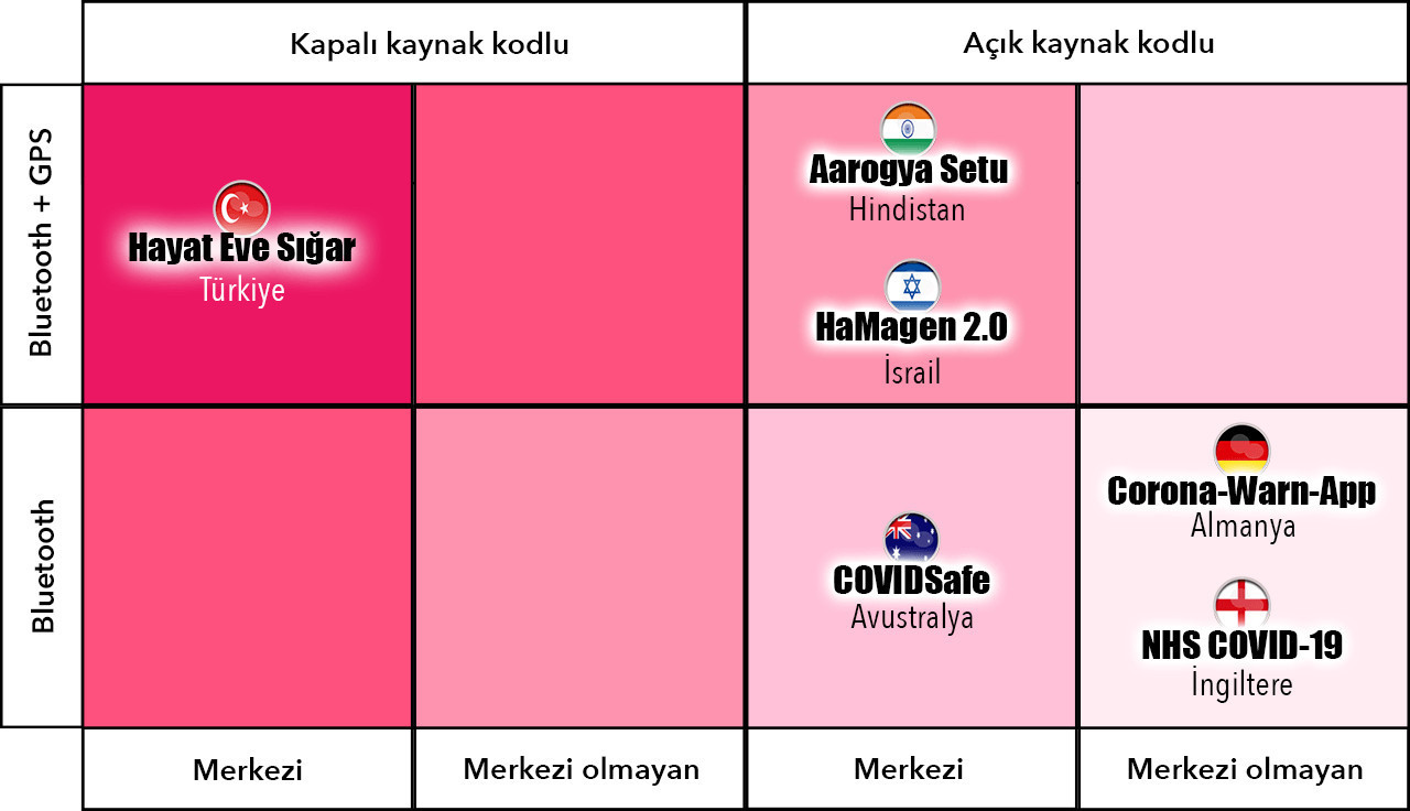 Öte yandan etkisi kanıtlanmış bir ilacın ya da aşının yokluğunda, Covid-19 krizi karşısında devletlerin elindeki araçlar zorunlu izolasyon, okulların ve iş yerlerinin kapatılması, maske-mesafe-temizlik üçlüsü ve HES benzeri temas takip uygulamalarından oluşuyordu. Singapur Hükümeti, Dünya Sağlık Örgütü’nün Covid-19 krizini pandemi ilan etmesinden yalnızca 9 gün sonra, 20 Mart 2020 tarihinde vatandaşlarına bir temas takip uygulaması sunarak bu alanda ilk oldu. Bugünse dünya genelinde 70’in üzerinde ülkede, 120’den fazla temas takip uygulamasının kullanımda olduğunu biliyoruz. Bu uygulamaların hepsinin amacı aynı olsa da çalışma prensipleri ve kullanıcılarından topladıkları veriler arasında büyük farklılıklar var.