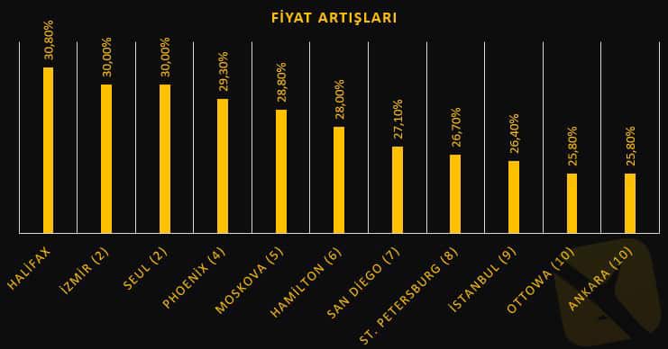 Rapora göre son bir yılda fiyatların en çok arttığı yer yüzde 30,8 ile Kanada’nın Halifax şehri.