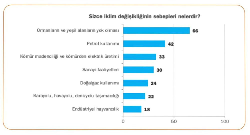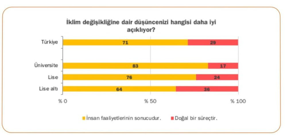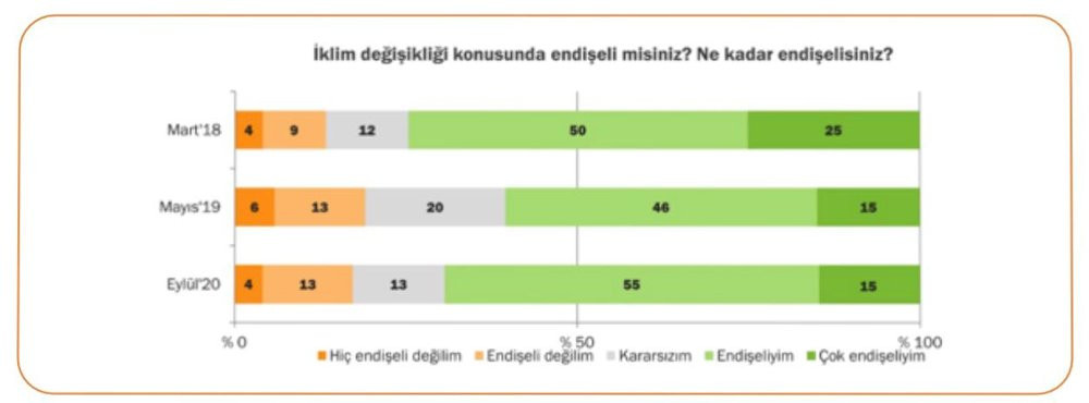 Araştırma aynı zamanda, iklim değişikliğinin Türkiye’de her 10 kişiden 7’sinin endişelendiği bir konu olduğunu gözler önüne serdi. Görüşülen kişilerin yüzde 14,7’si çok endişeli olduğunu ifade ederken, yüzde 54,6’sı ise endişeli olduğunu belirtti. Sonuçlar ayrıca, Türkiye’de toplumun yüzde 71,4 gibi bir oranla iklim değişikliğinin insan faaliyetlerinden kaynaklandığını da bildiğini gösterdi.