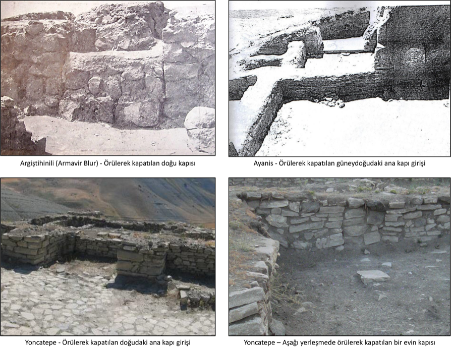 Urartu kentlerindeki yıkım tabakalarında karşımıza çıkan önemli bir diğer durum da yangından önce kapı girişlerinin örülerek köreltilmesidir. Bu, Urartu merkezleri üzerinde bir tehlikenin var olduğunun en önemli arkeolojik kanıtıdır. Bastam’da kuzey kapı girişinin, Ayanis’te güneydoğu yönündeki ana kapı girişinin, Armavir Blur’da batı sitadelde yer alan sarayın doğu yöndeki ana girişinin, Yoncatepe’deki konak yapısı ana girişi ve aynı döneme ait aşağı kentteki evlerin kapı girişlerinin örülerek köreltildiği görülmüştür.