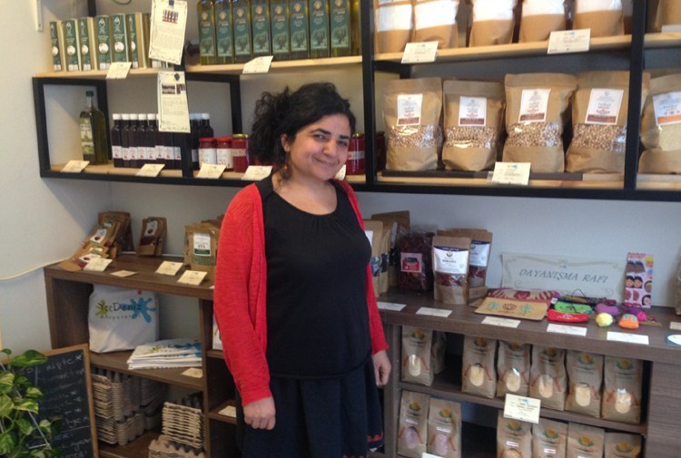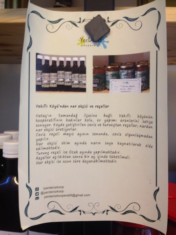 SE: Son olarak burada bir dayanışma rafımız var, ondan da bahsedeyim. Çok eşitsiz koşullarda üretim yapan üreticilere biz burada bir raf açıyoruz, onların ürünlerini ön ödemeli peşin olarak alıyoruz ve burada onların istediği fiyatlarla satışa çıkarmış oluyoruz. Kadın Kadına Mülteci Mutfağı, Göçmen Kadınlar gibi bu ülkede kendini daha yabancı hisseden kadınların üretimlerine burada yer veriyoruz.